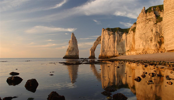 法国的象鼻山位于诺曼底地区的Etretat小镇,距离巴黎200多公里,是法国著名旅游景点之一! Etretat是上诺曼底省(诺曼底省分为上下)的沿英吉利海峡的小镇。Etretat和中国的桂林互为姐妹城市,大多是因为这两处的象鼻山的原因。Etretat的象鼻山可不是一般的大,走进了根本照不下全景。并且Etretat的象鼻山是个象鼻山群,它由三座象鼻形的白垩质悬崖组成。法国人形象的说成是一家子,公象,母象和小象。象鼻山都是地质现象,由于这种石质,长期收到海浪运动的冲击,当冲击的频率达到一定的程度,共振加大,就会导致崖壁局部的脱落,如果恰好外部的崖壁得以保存就形成了象鼻山。Etretat区区小镇,却是诺曼底地区著名的游览胜地,尤其受诗人、画家们的青睐。著名画家莫奈就是在勒阿弗尔长大的,并以此为素材,描绘了许多美丽的画卷;著名作家莫泊桑曾在这里度过一大段时光。有人说:如果埃菲尔铁塔是巴黎的象征, 那么, 埃特尔塔海岸就是法国诺曼底的象征。