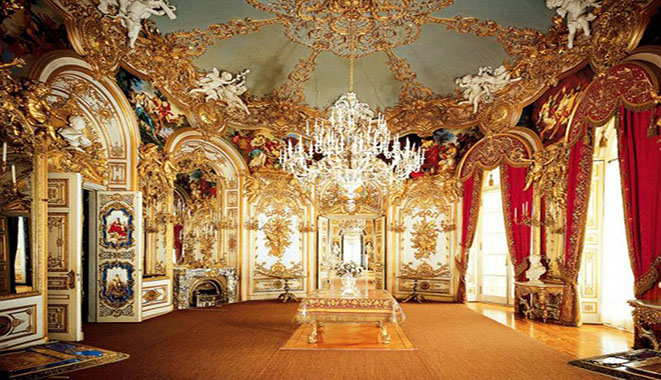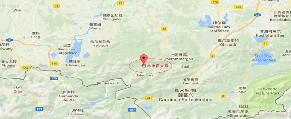 富饶的巴伐利亚的土地上被誉为 “童话国王”之一的“林德霍夫宫”坐落在僻静的格拉斯山谷中。于1874年到1878年间建造。是巴伐利亚国王路德维希二世建造的三座王宫中最小的一座,也是唯一他在世时完工的一座。林德霍夫宫强烈追求怪诞繁复的洛可可风格,并混杂着东方色彩。其中的餐室呈优美的椭圆形,室内采用闪亮的红色,奇特之处在于,餐室正中安放着可升降的“自动上菜魔桌”,也就是说,国王可以借此单独用餐而不会因为受到仆人的打扰而感到不安。