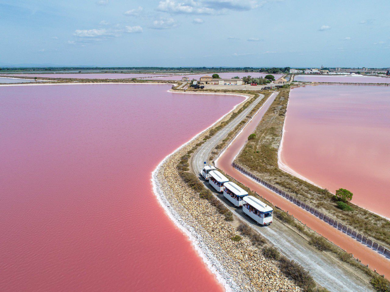 粉海其实是盐海,高盐的极端环境下,水里没有鱼,但存在大量的藻类与嗜盐菌类,这些微生物除了会将盐田变得又橘又粉之外,也是丰年虾的食物来源之一。丰年虾吃了盐后颜色转红,因此使海水染上了橘中带粉的颜色。