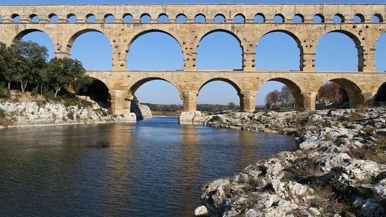 如果口袋中恰好有五欧元,您可以拿出来看看它的背面。这座世界最大古罗马桥,名为加尔水道桥。它跨越流经尼姆的加尔河,一桥多用,其“桥上桥”的布局凝结着古罗马人智慧的结晶,代表历经两千年文化洗礼的古罗马文明。从远处望去,气魄宏伟,蔚为壮观,为人世间之奇迹,历久而不堕,能保存至今,实属不易,已列为世界文化遗产。
